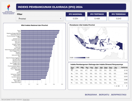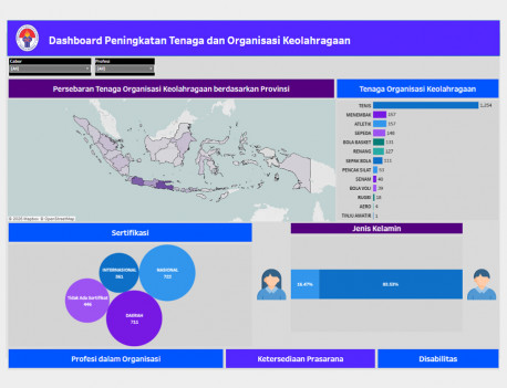 Visualisasi Satudata Kemenpora adalah representasi visual dari data yang telah dikumpulkan sehingga dapat digunakan untuk analisis data yang cepat, eksplorasi data, dan presentasi hasil dalam format yang menarik dan mudah diinterpretasikan sehingga data tersebut dapat diakses dan digunakan secara lebih efisien dan transparan. Visualisasi ini dapat berbentuk grafik, peta, dashboard, atau bentuk visual lainnya yang memudahkan pemahaman dan analisis data oleh publik maupun pembuat kebijakan. Tujuan utamanya adalah untuk meningkatkan keterbukaan informasi dan mendukung pengambilan keputusan yang lebih tepat berdasarkan data yang tersedia.